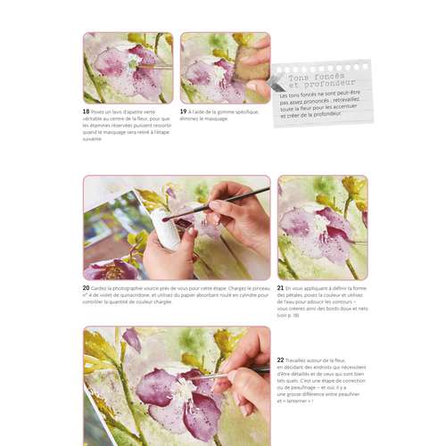 Au fil des projets en pas à pas, ils découvriront les innombrables possibilités qui s’offrent à eux en combinant l’aquarelle avec une palette de techniques humides et sèches, au travers de thèmes tels que les fleurs, les animaux, la danse et la musique. À la fin du livre, ils retrouveront toutes les méthodes qu’ils auront appris dans un paysage époustouflant, véritable point d’orgue de l’ouvrage, qui les dotera de la confiance et du savoir-faire nécessaire pour poursuivre votre voyage pictural.