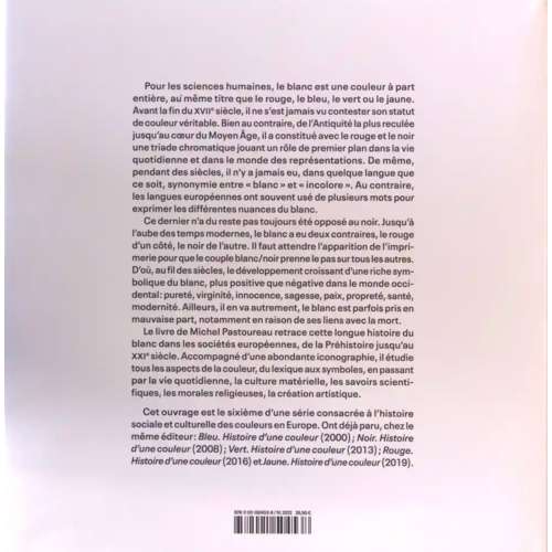 Dans cet ouvrage richement illustré, Michel Pastoureau retrace l’histoire sociale et culturelle du blanc en Europe, depuis l’Antiquité jusqu’à nos jours. Ce livre s’inscrit dans une série de monographies consacrées aux couleurs, explorant leur symbolique et leur impact dans l’histoire et les arts.