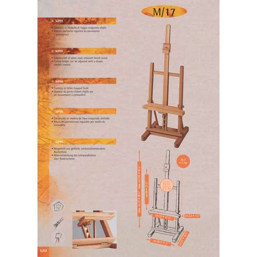 Chevalet de table Mabef construit en hêtre évaporé huilé. La hauteur du porte-châssis est réglée par un mouvement à crémaillère.