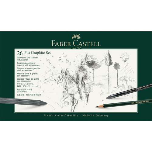 Le Set de crayons PITT Graphite FABER-CASTELL, grande boîte contient différentes pièces pour les esquisses, les dessins graphiques et les grandes surfaces.