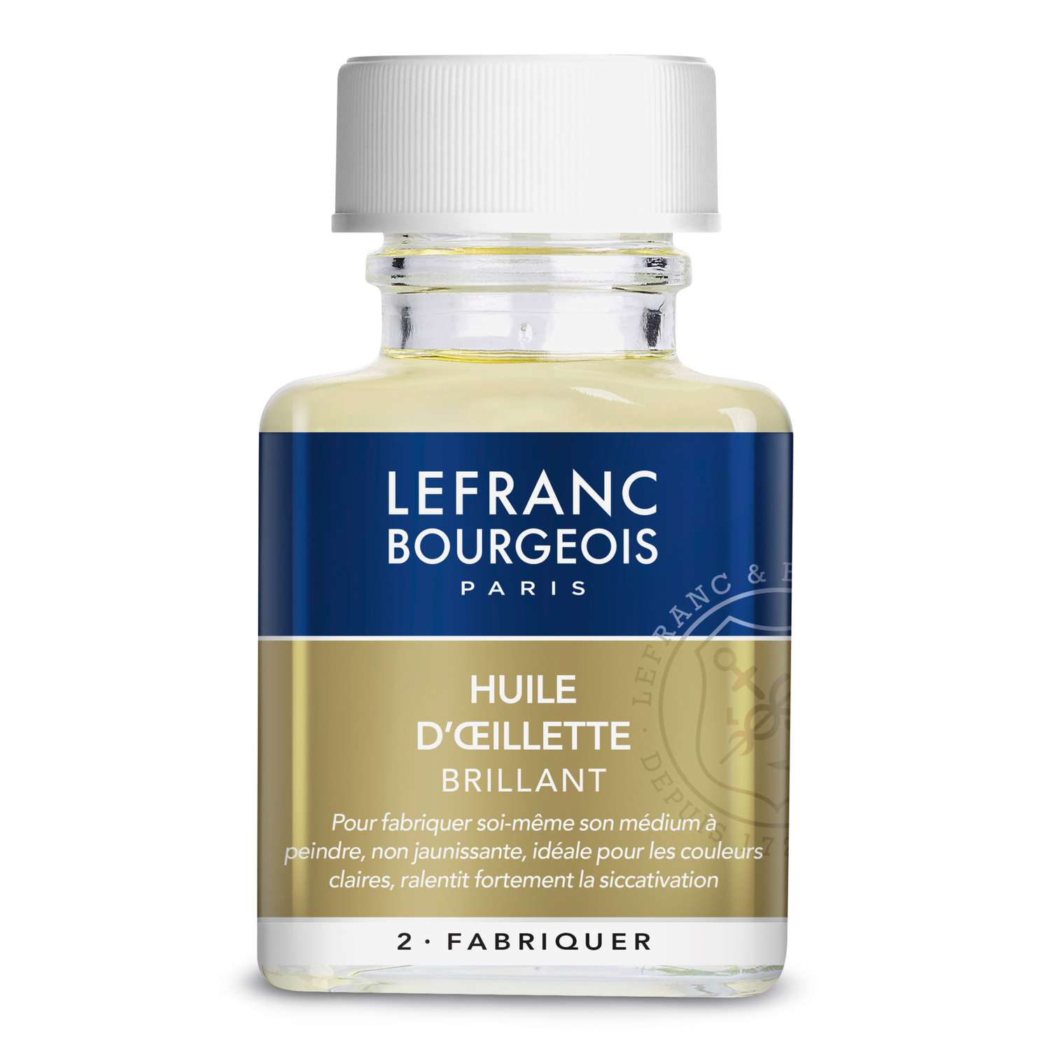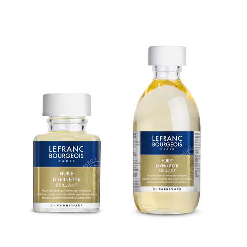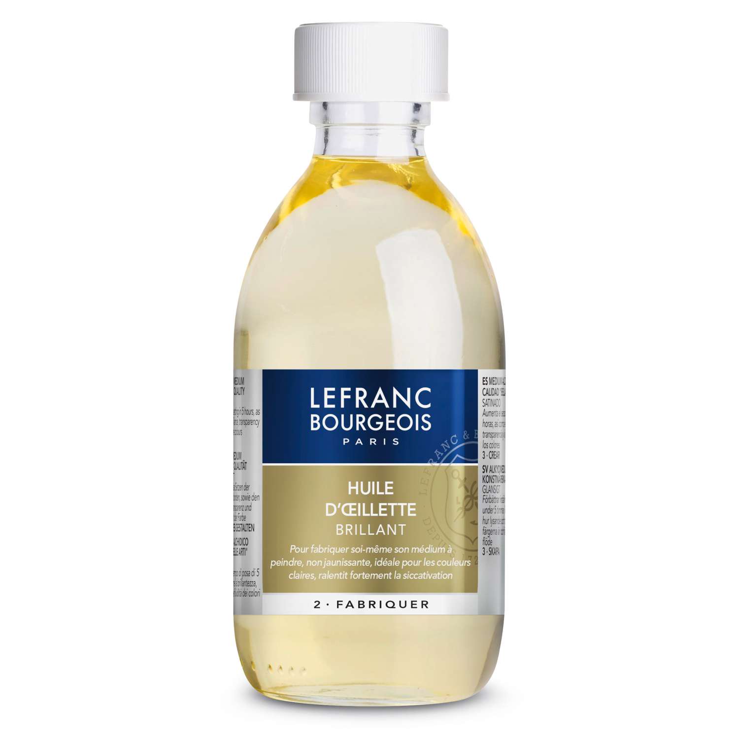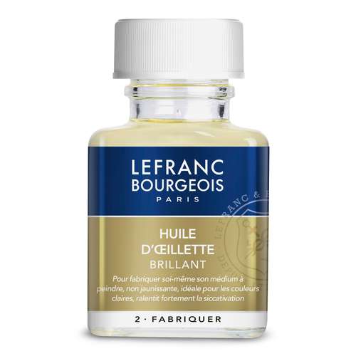Même usage que l'huile de lin, mais non jaunissante, l'huile d'oeillette est idéale pour les couleurs claires, ralentit fortement la siccativation. Aspect brillant. Extraite de graines de pavot et moins siccative que l'huile de lin, elle est parfaite pour réaliser des médiums à peindre.