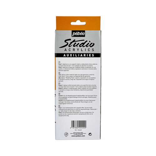 Pâte opaque de texture lourde prête à l’emploi pour créer des reliefs et des empâtements à effets craquelés. Afin d’augmenter l’adhérence de la Modeling Paste et de favoriser les craquelures, il est fortement conseillé de préparer le support (avec la phase 1). Le Modeling Paste effet craquelé (phase 2) de consistance pâteuse s’applique avec un couteau à peindre. Il peut s’utiliser seul ou en mélange avec les couleurs Studio Acrylics (référence 24267/... ) : 75 % modeling / 25 % couleur.
