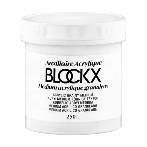 Découvrez le médium de texture Blockx pour un effet granuleux. Cet additif pour peintures acryliques créé une surface texturée et granuleuse qui confère à vos œuvres du relief et un caractère unique. Il se mélange directement à vos couleurs sans dégrader leurs caractéristiques.