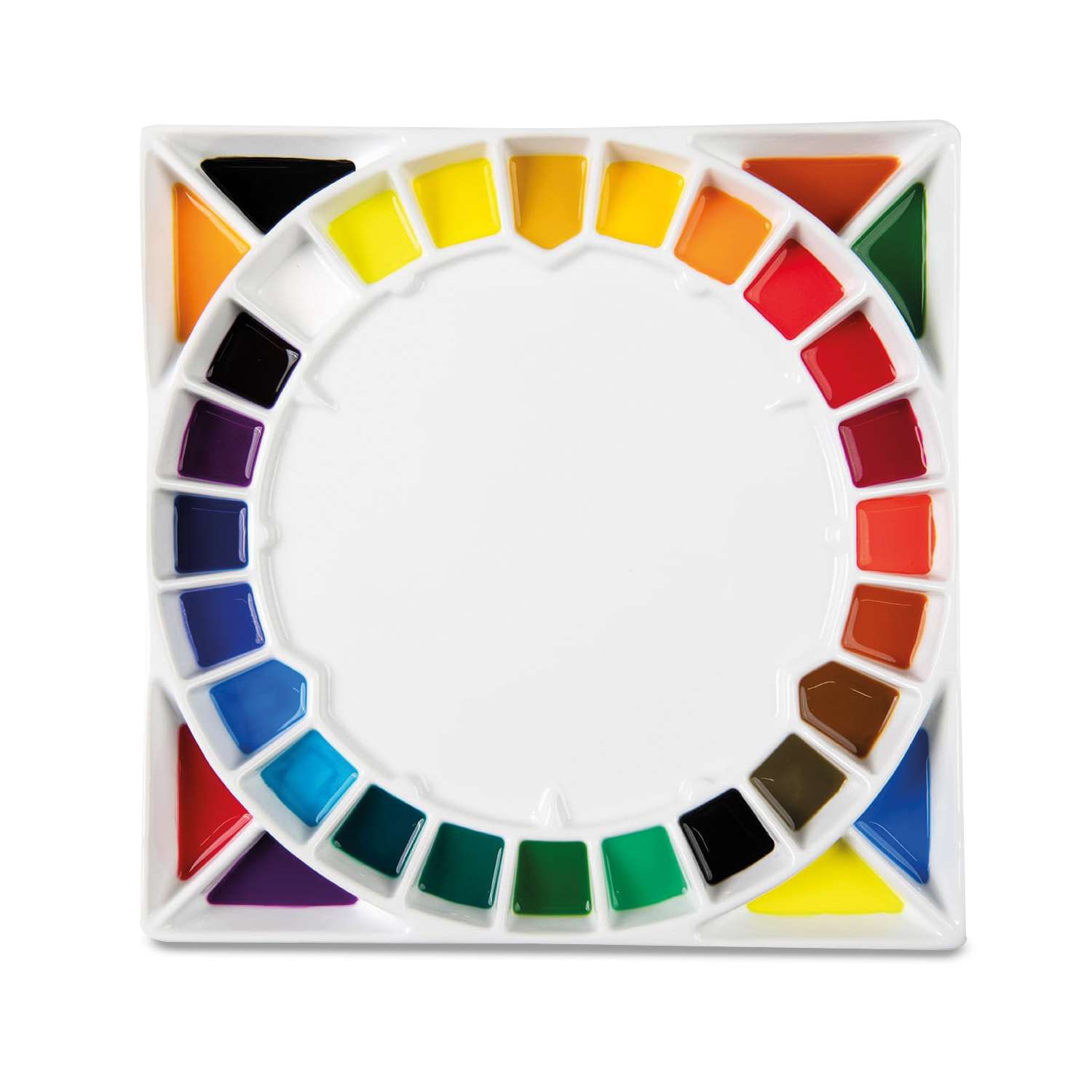 Cette palette carrée studio est parfaite pour organiser un cercle chromatique. De plus, les puits de mélange sont particulièrement profonds, ce qui permet d'y mettre plus de peinture — idéale pour travailler avec de la peinture huileuse ou acrylique plus pâteuse.
