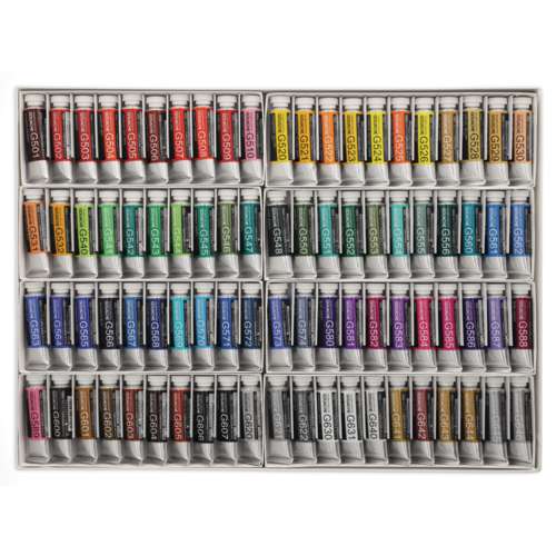 - 630 Blanc permanent, 606 Noir Ivoire, 604 Ombre brûlée, 603 Sienne brûlée, 524 Jaune Ocre, 589 Rose, 582 Magenta, 581 Violet, 580 Bleu Violet, 566 Bleu de Prusse, 565 Outremer foncé, 571 Bleu pur, 561 Bleu Turquoise , 546 Vert Olive , 542 Vert permanent prodond,, 545 Vert émeraude, 540 Vert feuille, 526 Jaune citron, 520 Jaune permanent, 522 Jaune Orange permanent, 508 Orange brillant, 507 Rouge flamme, 502 Carmin, 501 Alizarine Cramoisie