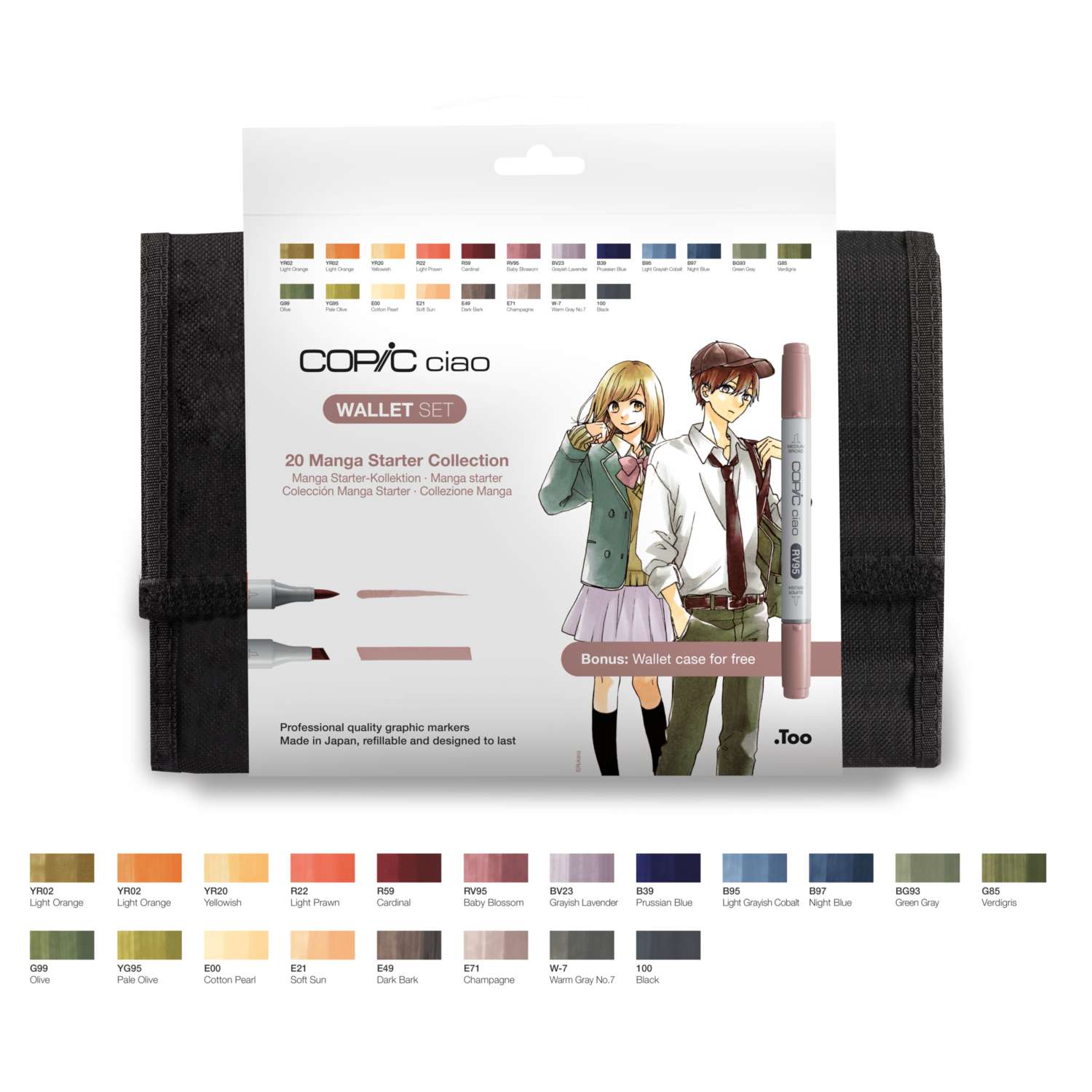 La trousse de 20 marqueurs Copic Ciao, contient une sélection de couleurs spécialement destinées à la réalisation de manga. Pochette noire.