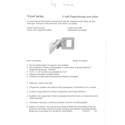 Vous pouvez utiliser le viseur Viewcatcher pour : créer des compositions réalistes, fixer l'horizon et le point central de l'oeuvre, observer un détail sans être perturbé par le reste de la composition, évaluer rapidement les bonnes balances des couleurs mais aussi pour faire les bons choix de valeurs, pour les professionnels, les amateurs et les étudiants !